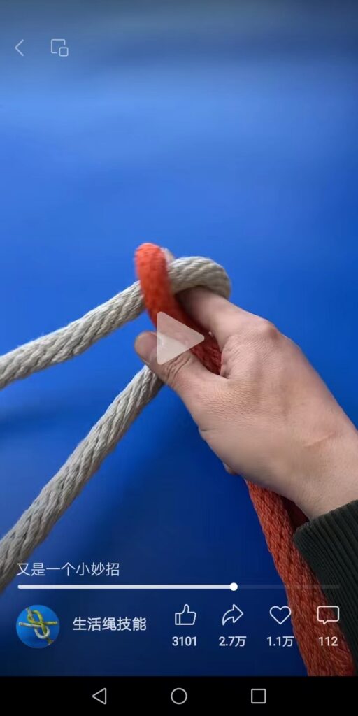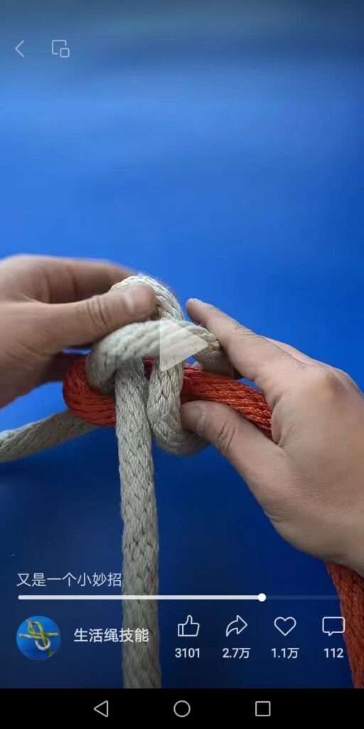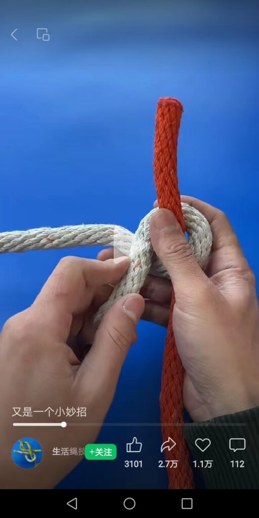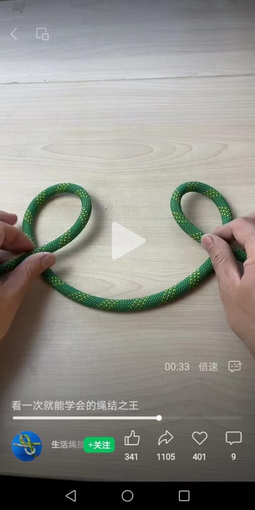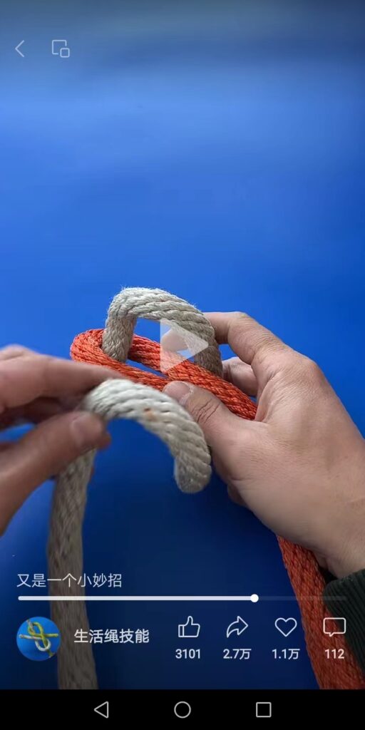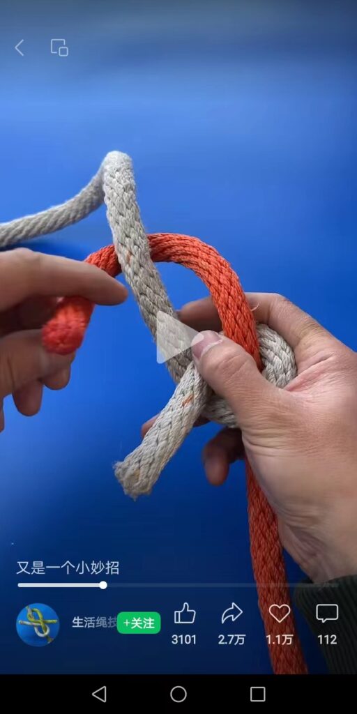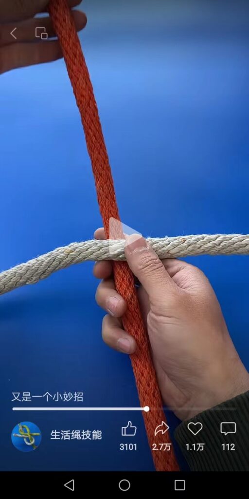 2.另一个是穿插式的绳头对结:结法简单,结点牢固,安全可靠,结实实用,受力绝对硬折不开,在需要使用绳头对结时,用这种方法各类绳子都可以用。不用一拉活头,就可解开。