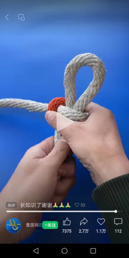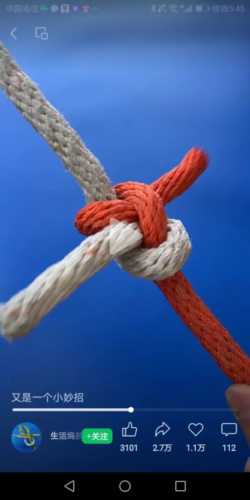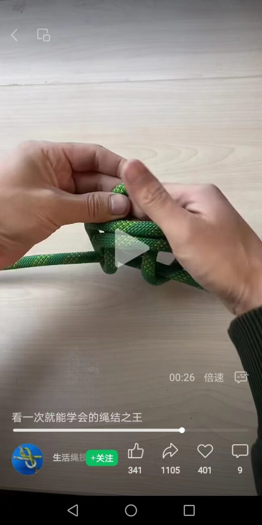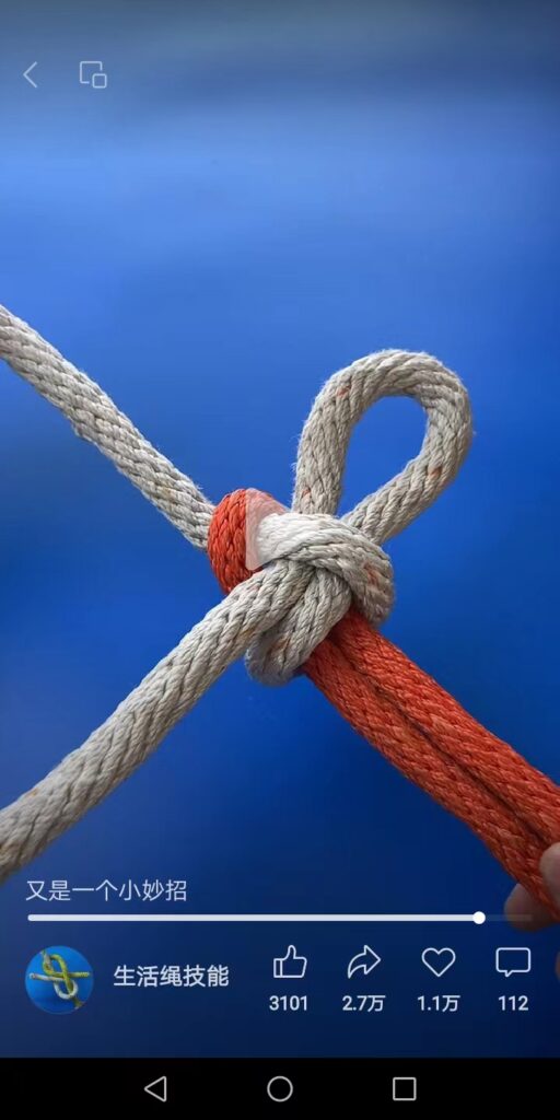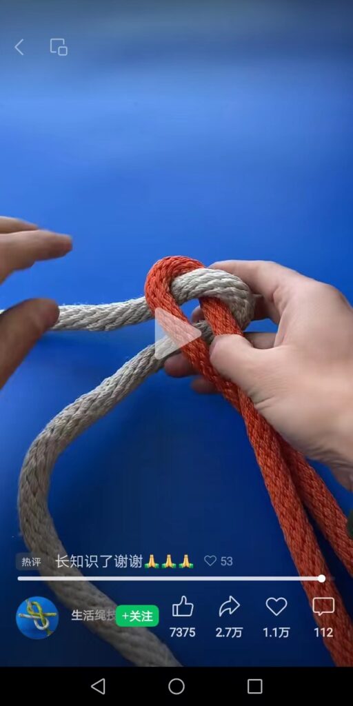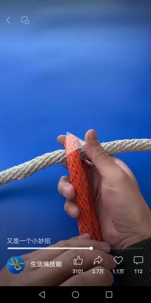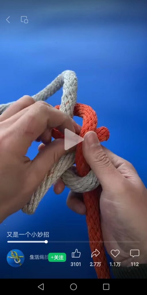 2.另一个是穿插式的绳头对结:结法简单,结点牢固,安全可靠,结实实用,受力绝对硬折不开,在需要使用绳头对结时,用这种方法各类绳子都可以用。不用一拉活头,就可解开。