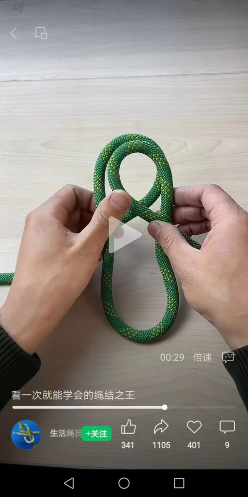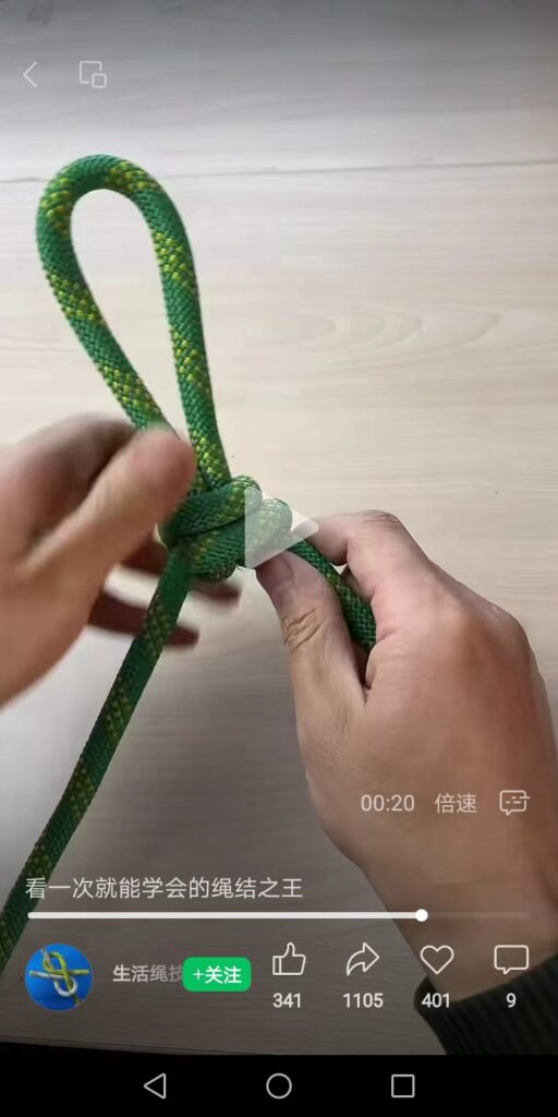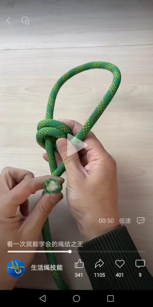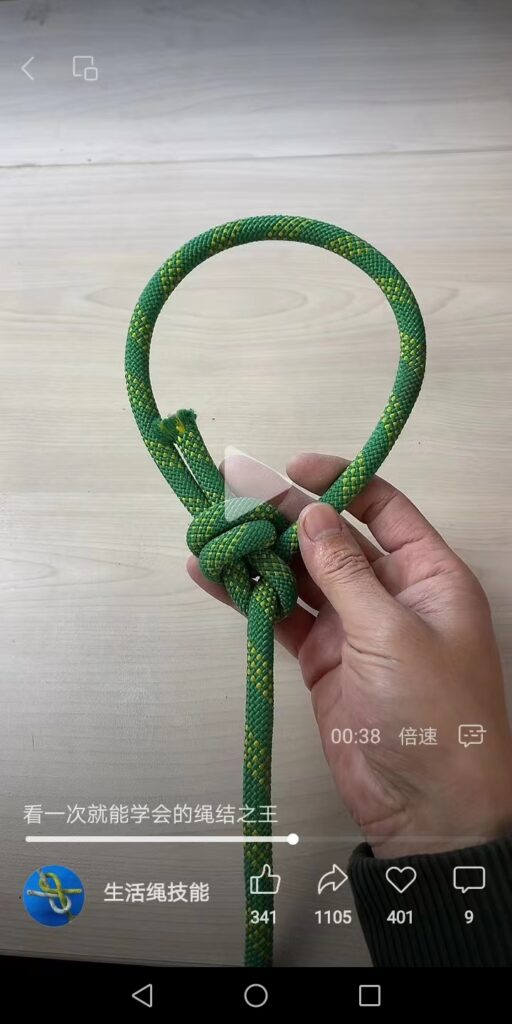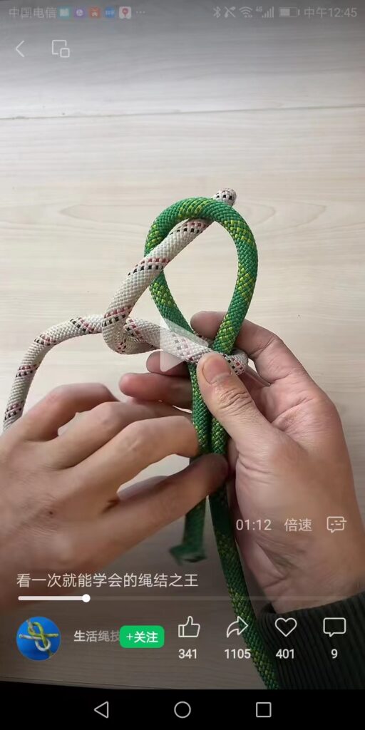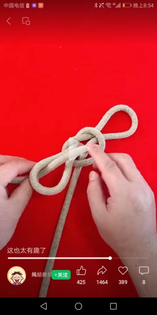 5.工程双蝴蝶结:拿出中间任意一端,两侧向内绕一圈,压住横向部分,双圈成形,平移重叠,下面的横向部分变成达环形,向上绕穿过双圈中间,向上拉,构成一个空中环形结。适用于高空架线,拖拽电缆。