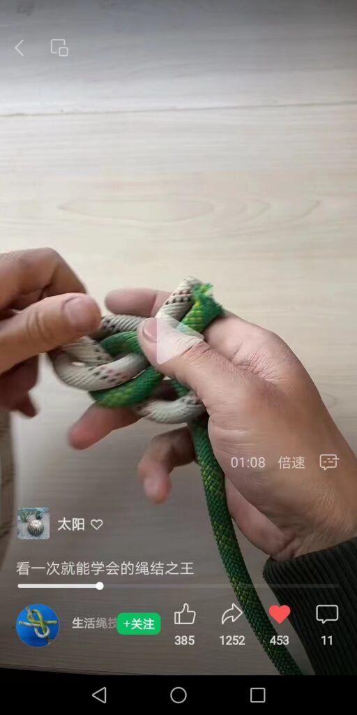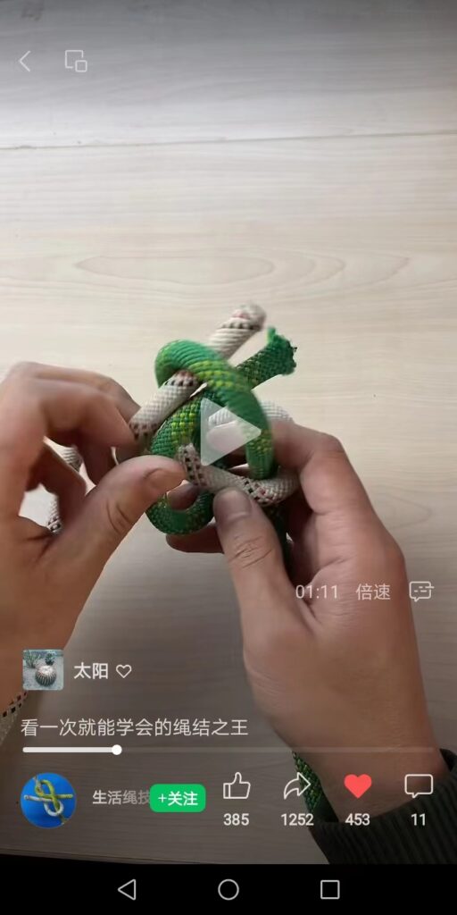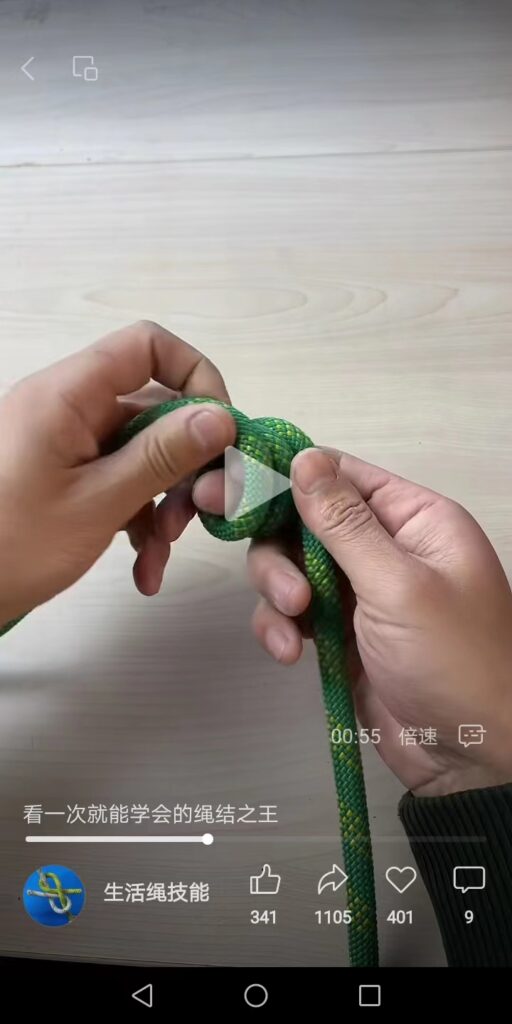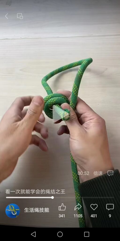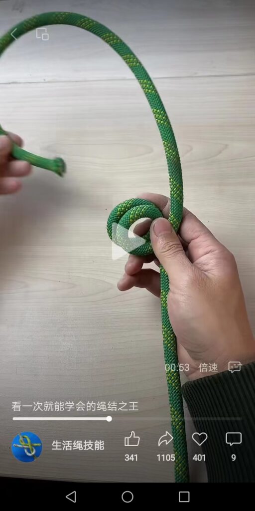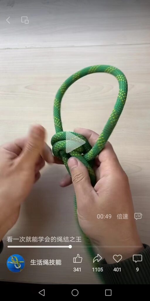 5.工程双蝴蝶结:拿出中间任意一端,两侧向内绕一圈,压住横向部分,双圈成形,平移重叠,下面的横向部分变成达环形,向上绕穿过双圈中间,向上拉,构成一个空中环形结。适用于高空架线,拖拽电缆。