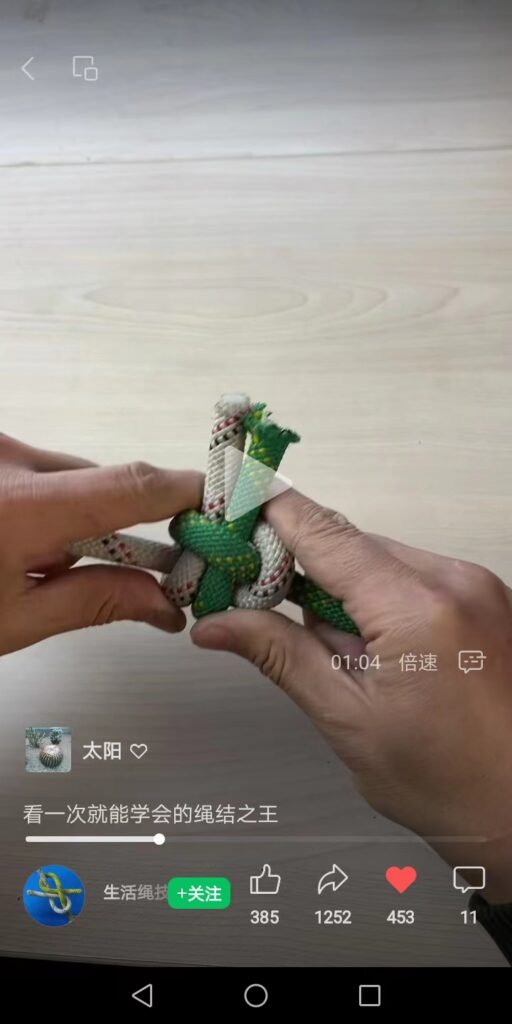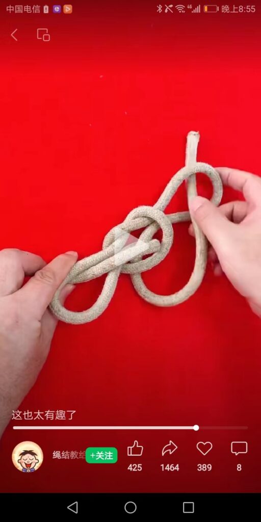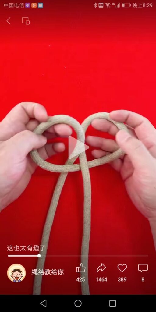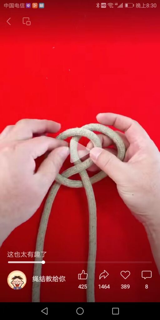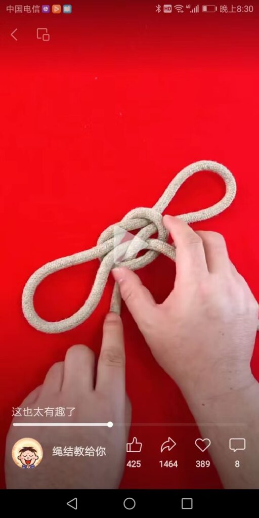 原是成人结,在手指上绕3圈,绳头要长,从上穿下2圈的孔,然后压住主绳,再次返回双圈之中,双向拉伸锁紧,构成一个单头绕结的环形结,也叫连牛结。
